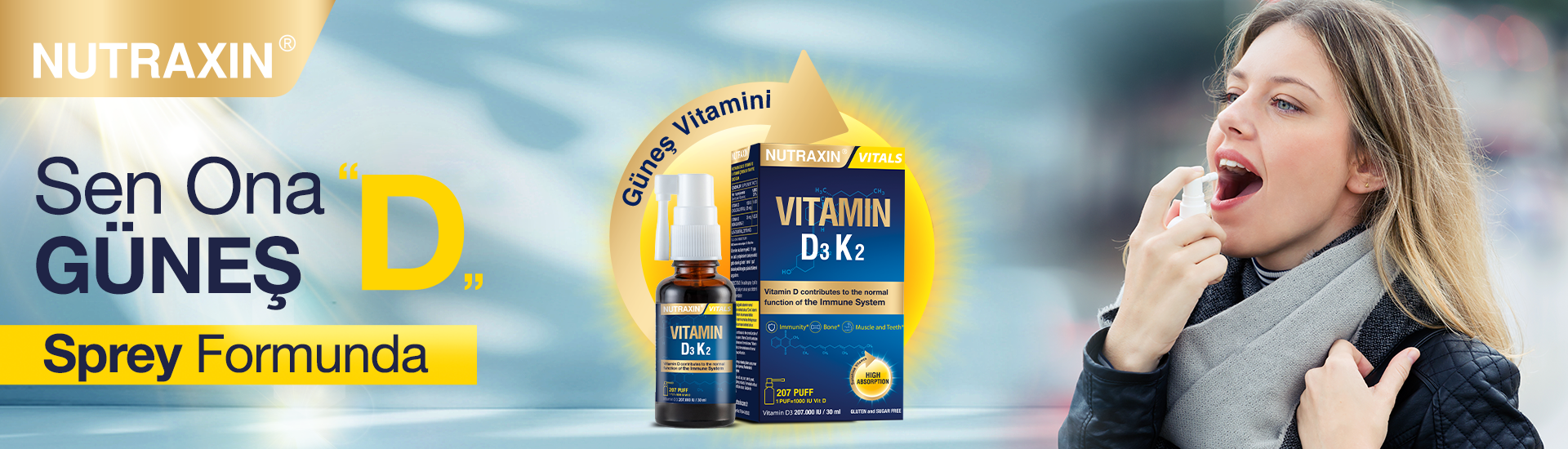 Nutraxin Vitamin D3K2 Sprey 30 ml, D3 ve K2 vitaminlerini içeren özel formülü ile bağışıklık sistemini güçlendirmeye, kemik ve diş sağlığını korumaya yardımcı olur. Sprey formu sayesinde hızlı emilim ve kolay kullanım sunar. Günlük hayatında yeterli güneş ışığı alamayanlar, bağışıklığını desteklemek ve kemik sağlığını korumak isteyenler için ideal bir takviyedir. Yüksek biyoyararlanım sunan Nutraxin D3K2, koruyucu ve katkı maddesi içermeyen doğal formülüyle sağlığınızı destekler.